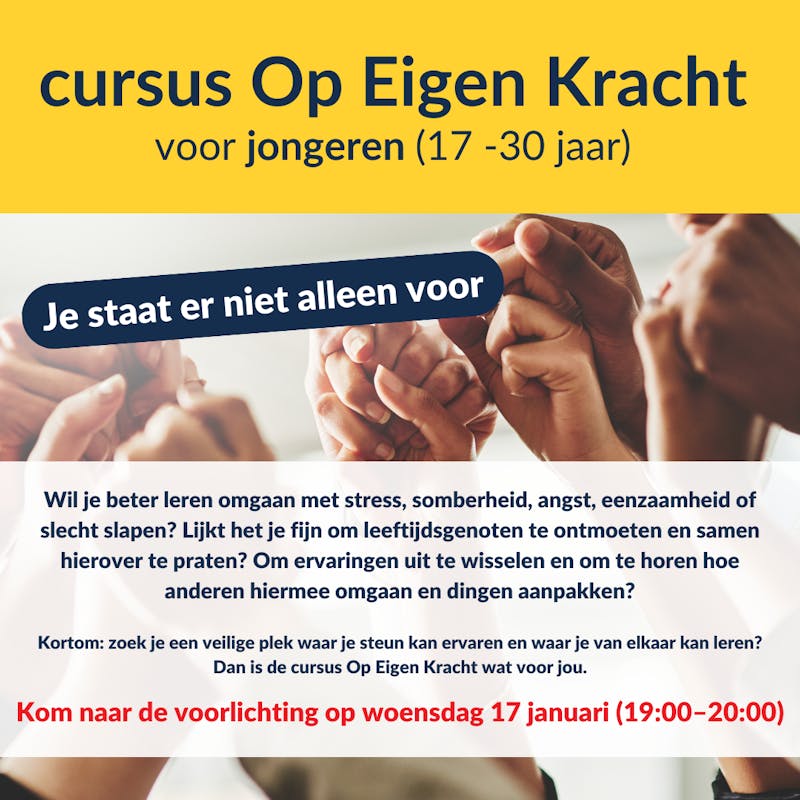 Kortom: zoek je een veilige plek waar je steun kan ervaren en waar je van elkaar kan leren? Dan is de cursus Op Eigen Kracht wat voor jou. De cursus start op 6 februari, duurt zes weken en is elke dinsdag van 19.00 tot 20.30 uur aan de Lange Zandstraat 15 in Deventer.