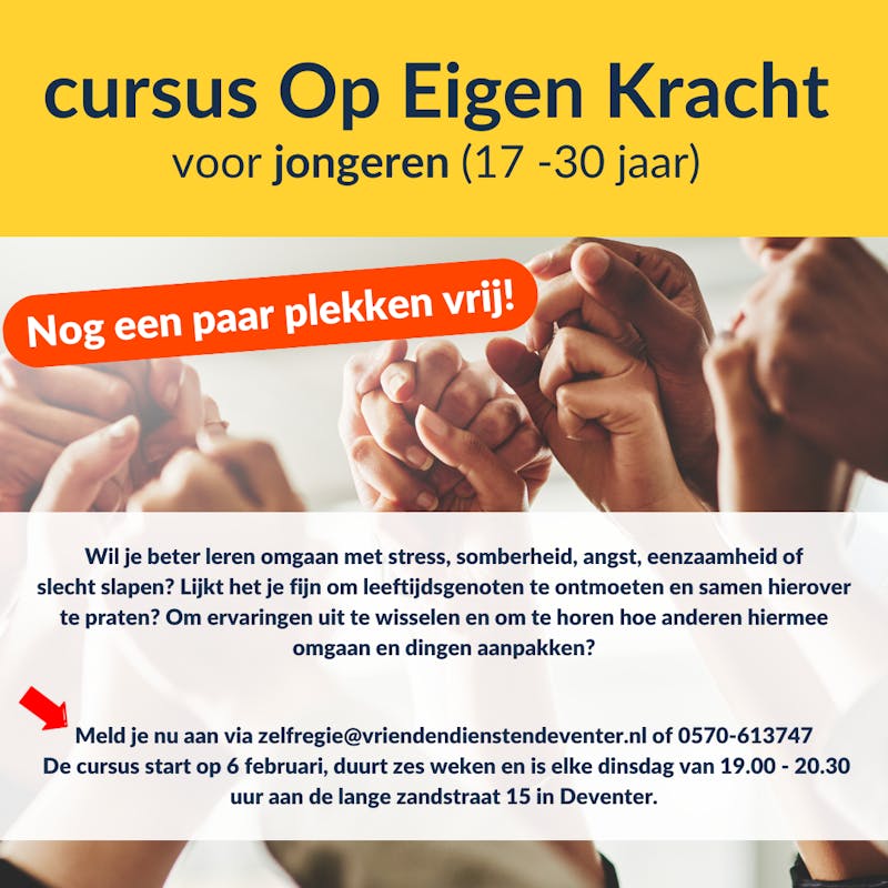 Meld je dan aan voor de cursus Op Eigen Kracht. Voor jongeren tussen de 17 en 30 jaar uit de gemeenten Voorst, Deventer, Olst-Wijhe en Raalte.