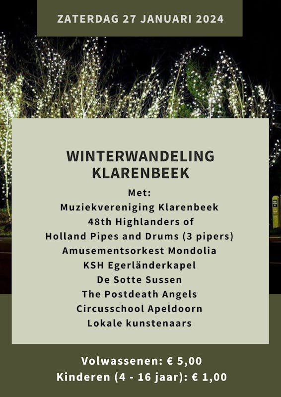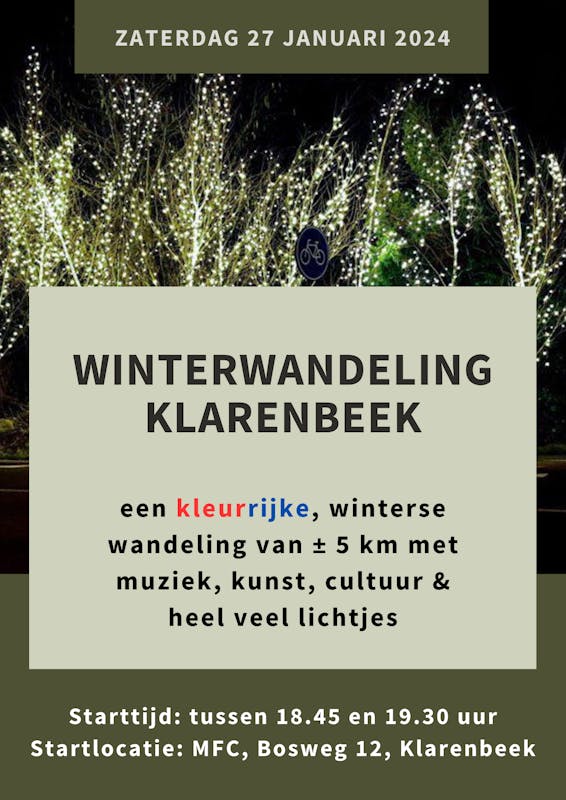 Op zaterdagavond 27 januari 2024 wordt in Klarenbeek de 6e editie van de Winterwandeling georganiseerd. Een bijzondere winterwandeltocht die in het teken staat van natuur, kunst en cultuur, dit keer met als thema Kleurrijk.