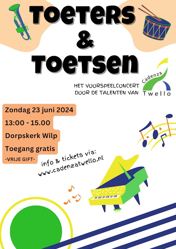 Kom op 23 juni naar de Dorpskerk in Wilp en geniet van een middag vol muziek en talent bij het voorspeelconcert Toeters en Toetsen. Mis deze kans niet om de sterren van de toekomst te zien schitteren op het podium!