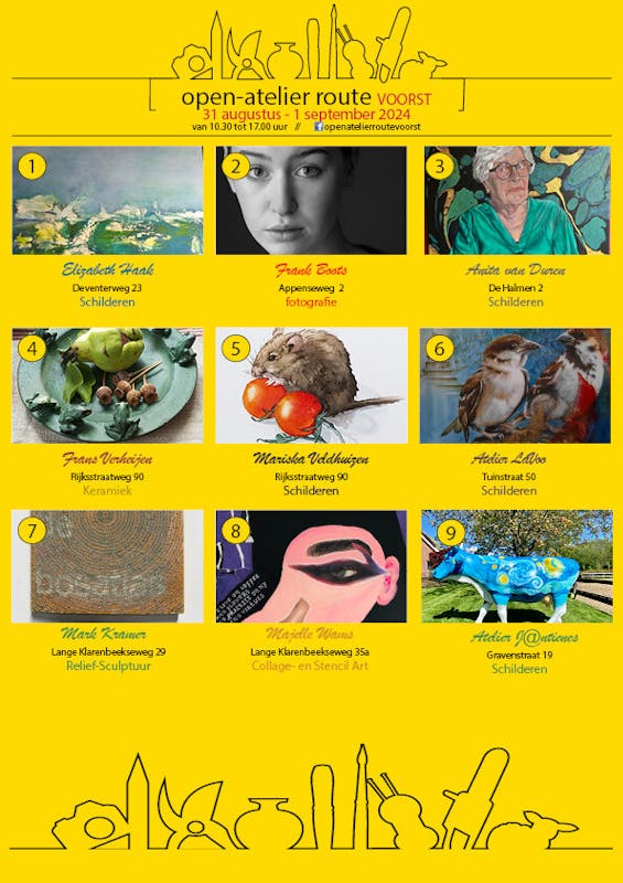 Op facebook kunt u alle informatie vinden over de deelnemende exposanten, locaties en de (fiets)route, die digitaal te openen is (QRcode). Ook vindt u hier het laatste nieuws: facebook/OpenAtelierrouteVoorst.nl