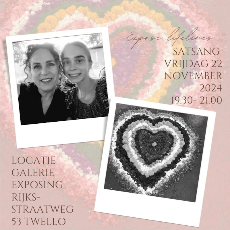 In samenwerking tussen de bedrijven Exposing & Lifelines organiseren Ingrid en Karlijn een Satsang, een spirituele bijeenkomst. Satsang betekent letterlijk "samen zijn in waarheid." Het is een samenkomst waarin we samenkomen om stilte, wijsheid en inzicht te delen. Door geleide meditatie, intuïtieve intentiekaarten, een lichtceremonie om je oude patronen in de krachtige groepsenergie te transformeren verdiepen we ons in het Zelf, weg van de drukte van gedachten en de buitenwereld. Satsang nodigt uit tot innerlijke rust, verbinding en een herinnering aan onze ware aard.