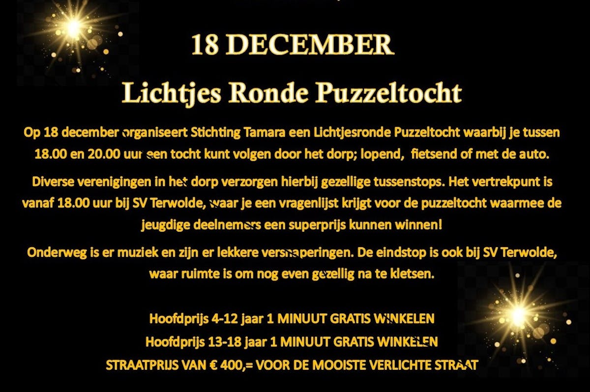 Terwolde in het licht 18 DECEMBER Lichtjes Ronde Puzzeltocht Op 18 december organiseert Stichting Tamara een Lichtjesronde Puzzeltocht waarbij je tussen 18.00 en 20.00 uur een tocht kunt volgen door het dorp; lopend, fietsend of met de auto. Diverse verenigingen in het dorp verzorgen hierbij gezellige tussenstops. Het vertrekpunt is vanaf 18.00 uur bij SV Terwolde, waar je een vragenlijst krijgt voor de puzzeltocht waarmee de jeugdige deelnemers een superprijs kunnen winnen! Onderweg is er muziek en zijn er lekkere versnaperingen. De eindstop is ook bij SV Terwolde, waar ruimte is om nog even gezellig na te kletsen.