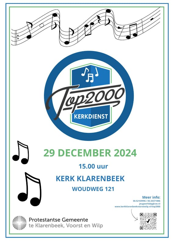 Op zondag 29 december is het zover. De eerste Top2000-kerkdienst in onze gemeente. De kerk van Klarenbeek wordt ingericht als gezellig Top2000-Café en onder genot van een hapje en een drankje kun je genieten van (én meezingen met) de live gespeelde muziek en horen waarom er op is gestemd.