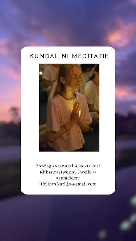 Praktische informatie: De Kundalini Meditatie vindt plaats op zondag 26 januari vanaf 16:15 is er inloop en de sessie start om 16:30 tot 17:30. De locatie is galerie Exposing aan de Rijksstraatweg 53 in Twello. Daarbij vraag ik een vergoeding van € 15 per persoon (contant bij binnenkomst). Neem eventueel je eigen meditatiepoefje of kussen mee als je dat fijn vindt.