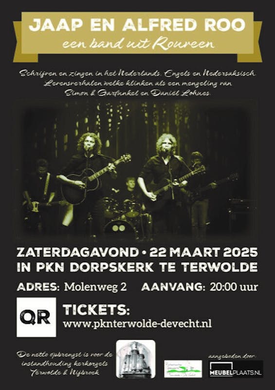 U bent van harte welkom bij dit bijzondere concert van de broers De Roo en band uit Rouveen. Zij schrijven en zingen levensverhalen in het Engels en Nedersaksisch. Deze klinken als een mengeling van Simon&Garfunkel en Daniël Lohues. Tickets: www.pknterwolde-devecht.nl.