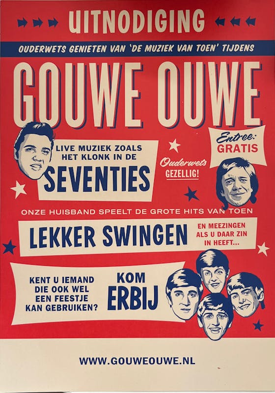 Een muzikale reis door het verleden. Droom weg bij Elvis, zing mee met de hits van Ramses Shaffy en swing mee op de klanken van The Beatles. Bij Gouwe Ouwe gaan we terug in de tijd en halen we muzikale herinneringen op. U bent van harte welkom, alleen of met partner, broer, zus, buur, vriendin of vriend. Gouwe Ouwe is dé plek om gezellig even samen te zijn.