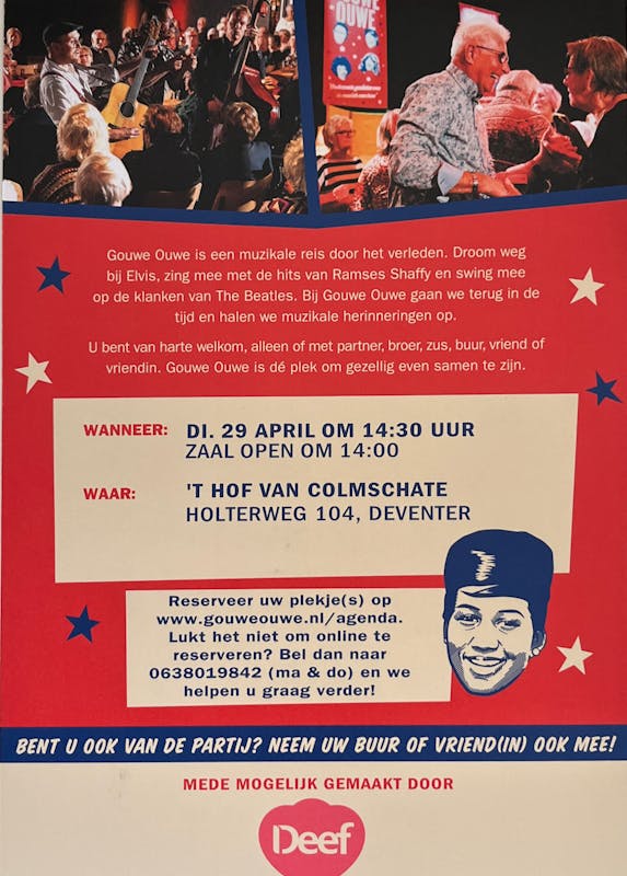 Kom GRATIS op dinsdagmiddag 29 april naar 't Hof van Colmschate. Reserveer uw plekje(s) op www.gouweouwe.nl/agenda. Lukt het niet om online te reserveren? Bel dan met 06-38019842 (ma & do) en we helpen u graag verder!