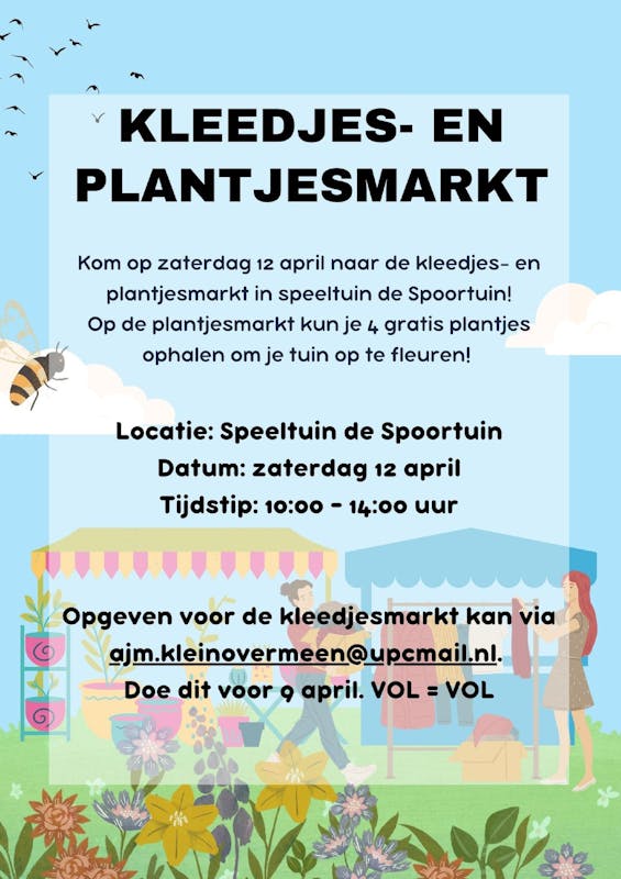 Kom zaterdag 12 april naar de kleedjes- en plantjesmarkt in Speeltuin De Spoortuin aan de Prins Bernhardstraat in Twello. Het evenement is van 10.00 tot 14.00 uur.