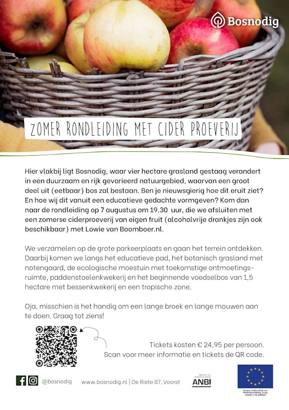 Op donderdagavond 7 augustus geeft Heleen een rondleiding, die we afsluiten met een verfrissende ciderproeverij, door Lowie van Boomboer.nl
