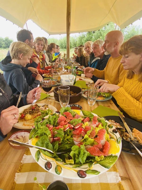 Schuif aan bij lange mooi gedekte tafels, geniet van heerlijk gezond eten - veelal van eigen bodem, van muziek, van een kampvuurtje en van een boel gezelligheid