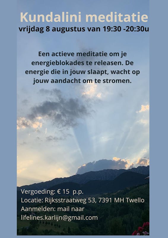 Praktische informatie: De Kundalini Meditatie vindt plaats op vrijdagavond 8 augustus vanaf 19:15 is er inloop. De locatie is galerie Exposing aan de Rijksstraatweg 53 in Twello. Daarbij vraag ik een vergoeding van € 15 per persoon (contant bij binnenkomst).