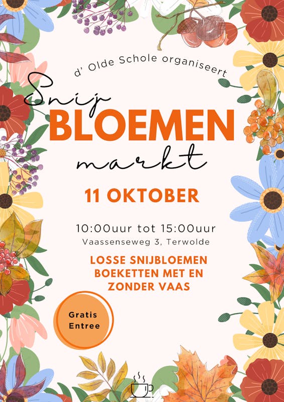 Het is weer tijd voor de jaarlijkse snijbloemenmarkt in het Dorpshuis d'Olde Schole Terwolde. Op zaterdag 11 oktober staan er weer bloemisten voor u klaar om een door u zelf samengesteld boeket te binden. Er zullen ook kant-en-klare boeketen met of zonder vaas voor u klaar staan. Ook is er gelegenheid om gezellig een kopje koffie of thee te drinken en bij te kletsen. Toegang is gratis!