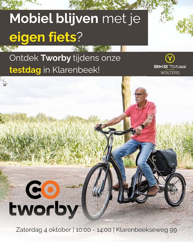 Tijdens de Tworby testdag op zaterdag 4 oktober kun je zelf ervaren hoe zoβn driewielfiets rijdt. Tussen 10:00 en 14:00 uur ben je van harte welkom om te testen Γ©n in gesprek te gaan met de experts van Tworby. Zij vertellen je alles over hoe het werkt, wat de mogelijkheden zijn en of het iets voor jou is. Ook is er een ergotherapeut aanwezig om mee te kijken en persoonlijk advies te geven.Β