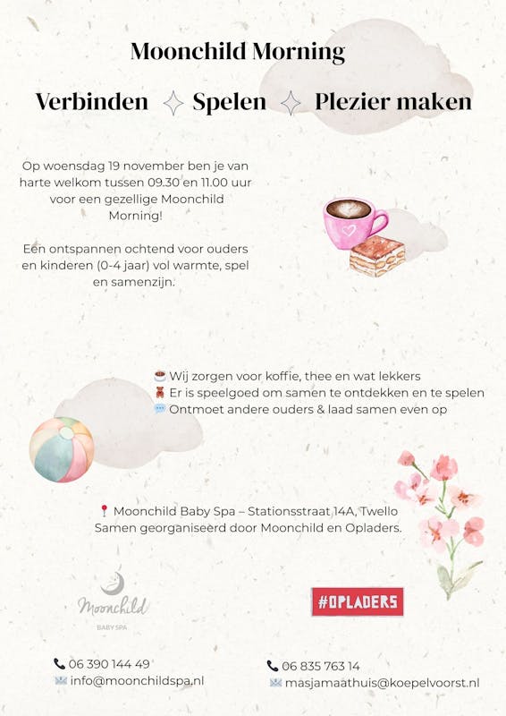 Je bent van harte welkom tussen 9.30 en 11.00 voor een ontspannen ochtend voor ouders en kinderen (0-4 jaar) vol warmte, spel en samenzijn. Wij zorgen voor koffie/thee en wat lekkers. Er is speelgoed om samen te ontdekken en te spelen. Ontmoet andere ouders en laad samen even op.