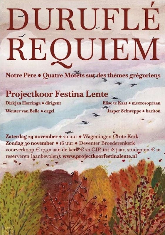 De Franse componist en organist Maurice Duruflé (1902-1975) was leerling van Paul Dukas (1865 – 1935) en vanaf 1944 als leraar verbonden aan het conservatorium in Parijs. De meeste van Duruflés werken zijn religieus. Zijn meesterwerk, het Requiem opus 9 uit 1947 voor solostem, koor en orgel, wordt in november uitgevoerd door Festina Lente.Duruflé baseerde deze compositie op de gregoriaanse dodenmis. Ondanks het sombere thema spat de energie en de optimistische kijk op de dood uit de noten. Dit magistrale werk herbergt veel Gregoriaanse melodieën, gestoken in een impressionistisch jasje. Het is alsof je een groep Franse monniken hoort zingen onder begeleiding van fraaie akkoorden en innige melodieën. De componist zocht zijn muzikale troost in herfsttinten en droeg het werk op aan zijn vader. Het stuk straalt berusting uit en een haast vanzelfsprekend vertrouwen dat alles goed komt en dat je niet bang hoeft te zijn dat de hemel voor jou gesloten blijft. Voor deze uitvoering is het koor flink op sterkte. Meer dan dertig ervaren koorzangers storten zich in deze meeslepende muziek. De afwisseling met solisten én de begeleiding op groot orgel maakt de luisterervaring compleet.