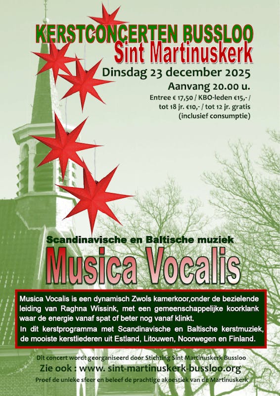 Musica Vocalis is een dynamisch Zwols kamerkoor. “We werken gedegen, maar zijn niet degelijk. We houden van vuurwerk maar raken niet uitgeblust”. Het kamerkoor staat onder bezielende leiding van Raghna Wissink. In het programma met Scandinavische en Baltische kerstmuziek de mooiste liederen uit Estland, Litouwen, Noorwegen en Finland.