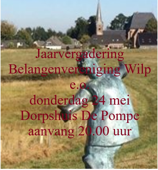 De BelangenverenigingWilp e.o houdt op donderdag 24 mei a.s. haar jaarvergadering in Dorpshuis DePompe te Wilp.
