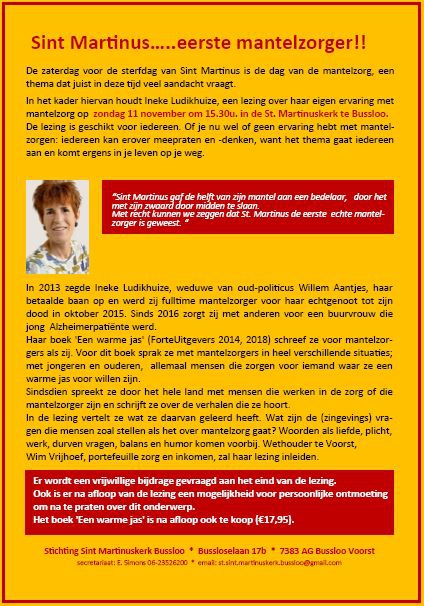 In het kader hiervan wordt op zondag 11 november om 15.30u. een lezing over mantelzorg gegeven door Ineke Ludikhuize in de voormalige St.Martinuskerk in Bussloo. Ineke schreef ook het boek een “warme jas” . Zie bijgaande flyer.