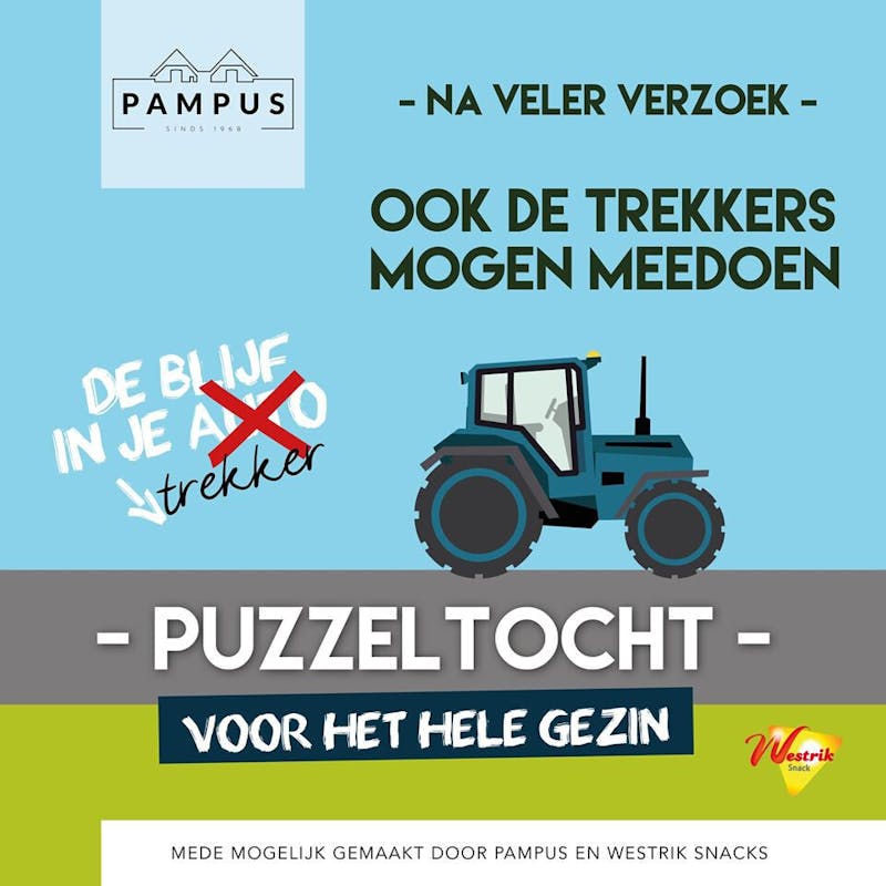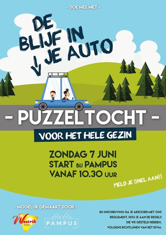 De - blijf - in - je - auto Puzzeltocht is voor Stichting Pampus een bekend concept. Een mooie rit door de omgeving van de Gemeente Voorst. Samen met je gezin, familie of vrienden kun je puzzelen om de route te volgen met leuke opdrachten en activiteiten onderweg. Aan het einde ontvang je een heerlijke take-away maaltijd van Westrik Snack.