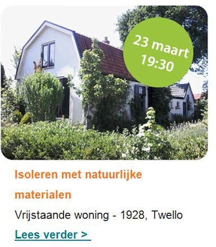 Wil je meer weten over een bepaald type huis of over hoe een maatregel is toegepast in een woning? Schrijf je dan in voor een online thematour! Hierbij geeft de huiseigenaar vanuit zijn eigen ervaring een presentatie over een bepaald thema of type woning, en is er genoeg ruimte om vragen te stellen. Er zijn 6 - 8 plekken per thematour, dus schrijf je snel in! Of bekijk de verdere uitleg.