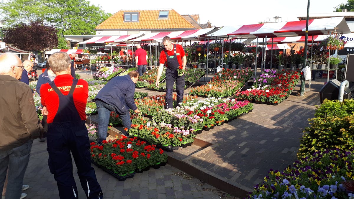 ’s Morgens vroeg worden de gereserveerde planten in alle vroegte naar het Dorpsplein gebracht. Verser is niet mogelijk. Daar staan de 16 vrijwilligers in hun rode kledij klaar om alles mooi in de kramen en op de trappen van het plein uit te stallen.