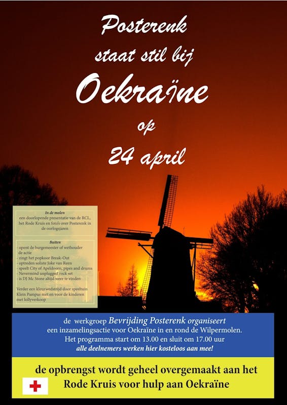 Werkgroep Bevrijding Posterenk organiseert een inzamelingsactie voor Oekraïne. Er zijn buiten optredens van popkoor Break-Out, soliste Joke van Reen, City of Apeldoorn; pipes and Drums en Nevermind. Daarnaast organiseert de speeltuin Kleinpampus een kleurwedstrijd en verkopen ze lolly’s . Binnen de molen is er een presentatie van de Royal Canadian Legion en foto’s over de oorlog in Posterenk. Alles in samenwerking met het Rode Kruis en wordt de opbrengst geheel overgemaakt