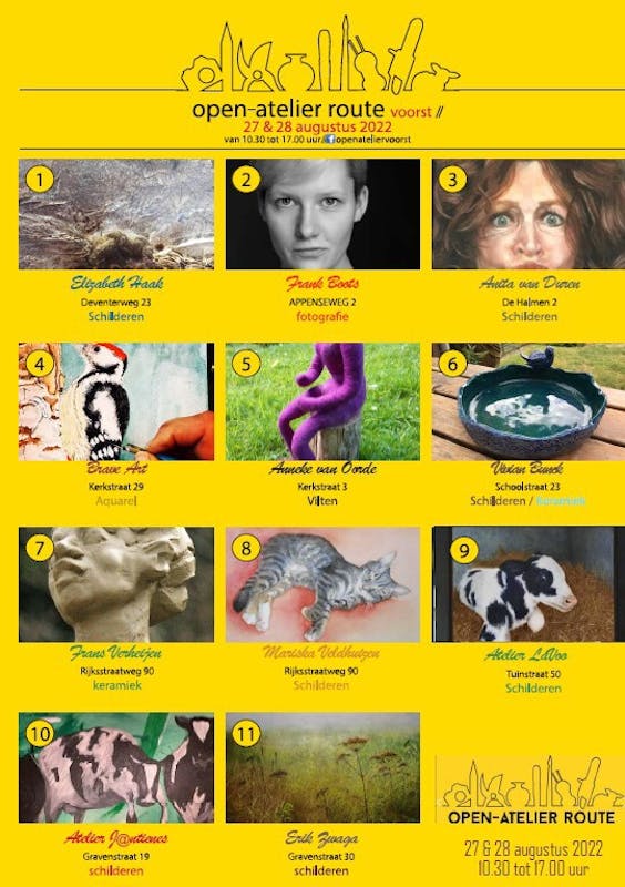 Dit maakt deze route onderscheidend in Voorst: geen expositie op een willekeurige locatie, maar bij de bron, waar kunst van hoog niveau ontstaat. U kunt kennismaken met kunstenaars en luisteren naar hun inspiratiebronnen en beweegredenen, kijken hoe dat kunstwerk daadwerkelijk tot stand komt en u kunt het - als u er door geraakt wordt - ook kopen. Het doel van de Open Atelierroute Voorst is om een breed publiek kennis te laten maken met kunst en vormgeving. Getuige het hoge aantal enthousiaste bezoekers tijdens voorgaande jaren wordt met deze Open AtelierRoute in een behoefte voorzien. Openingstijden 10.30-17.00 uur.
