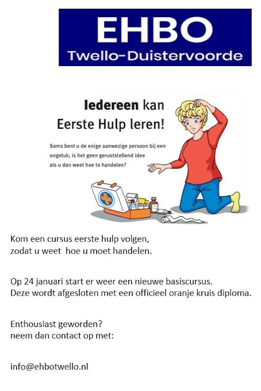 EHBO Twello-Duistervoorde organiseert een basiscursus EHBO. Deze start op 24 januari Er zijn nog plekken vrij. Wil je ook kunnen helpen in een noodsituatie en kunnen reanimeren? Ook Kinder ehbo is inbegrepen. Geef je dan nu op!