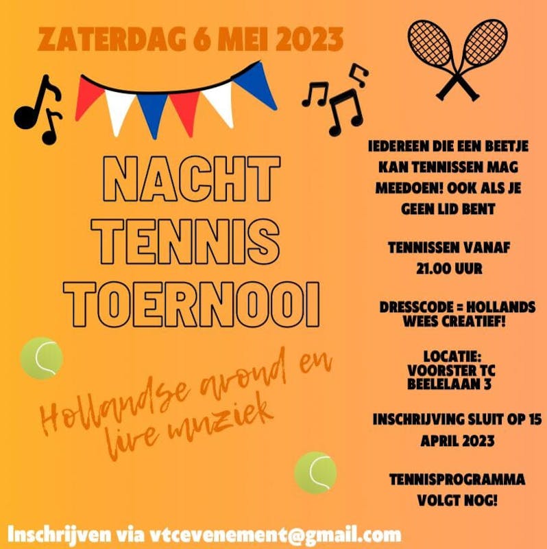We organiseren een nacht tennistoernooi in combinatie met een Hollandse avond met livemuziek en heel veel gezelligheid! Er gaat uiteraard ook getennist worden en daar hebben wij jou voor nodig! Iedereen die een beetje kan tennissen is welkom, dus sleur je partner van de bank, app je oude tennismaatjes, je vrienden, je familie, je buren, oude vakantieliefdes of wie dan ook. Wij gaan er een onwijs gezellige en sportieve avond van maken en daar hebben wij zoveel mogelijk mensen voor nodig. Dit alles gaat plaatsvinden op zaterdag 6 mei vanaf 21.00 uur. Het tennisschema volgt nog. Als je niet in staat bent om te tennissen, maar wel zin hebt in een drankje en om de rest van de sportievelingen aan te moedigen dan ben je uiteraard ook van harte welkom! De dresscode op deze avond is Hollands, dus trek je gekste Hollandse outfit aan en wees creatief! kosten zijn €7,50. Meld je aan Vóór 15 april op en hopelijk zien we je op 6 mei.
