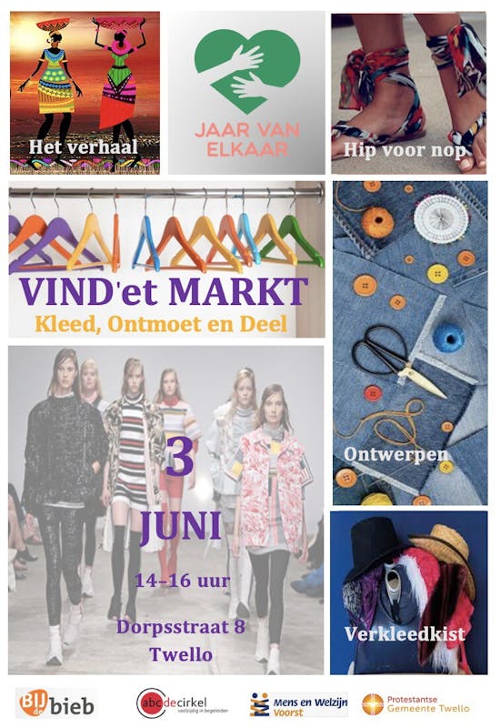 En dan? Uit alle inzendingen selecteert de jury tien kledingstukken. De ontwerpers mogen hun nieuwe items op de catwalk van de Vind’et Markt tonen aan het publiek. Daarna maakt de jury de winnaar bekend van het leukste kledingstuk. Voor de winnaar is er een leuke prijs. Organisatie en praktische informatie De markt wordt georganiseerd door de inclusiewerkgroep Jaar van Elkaar, waarvan Bij de Bieb, Mens en Welzijn Voorst, ABC de Cirkel en PG Twello deel uitmaken. De Vind’et Markt is zaterdag 3 juni van 14- 16 uur in het Irenegebouw aan de Dorpsstraat 8 in