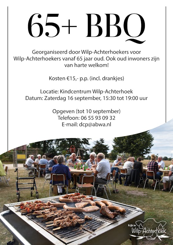65+ BBQ voor Wilp-Achterhoekers en ook oud-inwoners zijn van harte welkom. Een middag waar men elkaar ontmoet en bij kan praten onder het genot van een BBQ en een drankje.