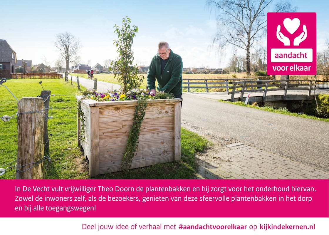 Midden in het dorp en bij alle toegangswegen van de Vecht staan sfeervolle plantenbakken die door vrijwilliger Theo Doorn worden gevuld en onderhouden. “Helaas zijn er op twee plekken buiten het dorp rond de jaarwisseling twee plantenbakken opgeblazen”, vertelt Theo. Eeuwig zonde! Gelukkig zijn er twee mooie grote houten bakken voor in de plaats gekomen, gemaakt door de lokale zorgwerkplaats. Die zorgen voor extra sfeer in het dorp, wat door zowel inwoners als bezoekers zeer gewaardeerd wordt.