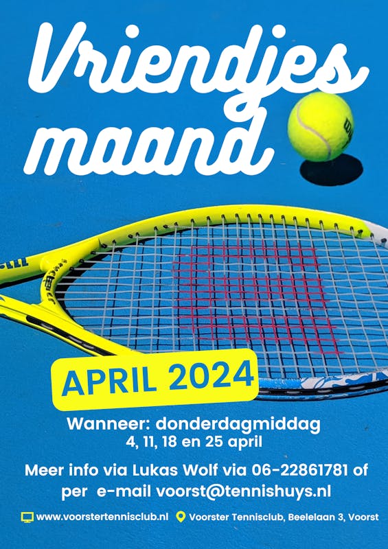 April staat bij de Voorster Tennisclub in het teken van Vriendjesmaand. Dit is een speciale actie in de maand april gericht op het laagdrempelig kennis laten maken van kinderen met tennis. Huidige jeugdleden kunnen een vriendje of vriendinnetje meenemen naar de tennisles. De lessen vinden plaats op donderdagmiddag (4, 11, 18 en 25 april). Na het meedoen met een les is het natuurlijk mogelijk om je aan te melden voor tennisles en lid te worden van de Voorster Tennisclub. Behalve tennisles worden er voor de jeugdleden meer activiteiten georganiseerd zoals een jaarlijks uitje, ouder-/kindtoernooi, clubkampioenschappen en toss-avonden. Voor meer informatie kan contact worden opgenomen met Lukas Wolf via 06-22861781 of via e-mail . https://voorstertennisclub.nl/