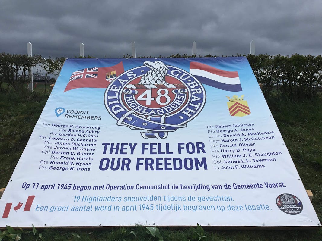 Vandaag precies 76 jaar geleden, op 11 april 1945, begon met Operation Cannonshot de bevrijding van de gemeente Voorst. 19 Highlanders sneuvelden tijdens de gevechten. Een groot aantal werd tijdelijk begraven op deze plek in Wilp. Goed dat er ook nu een eervol herdenken is!