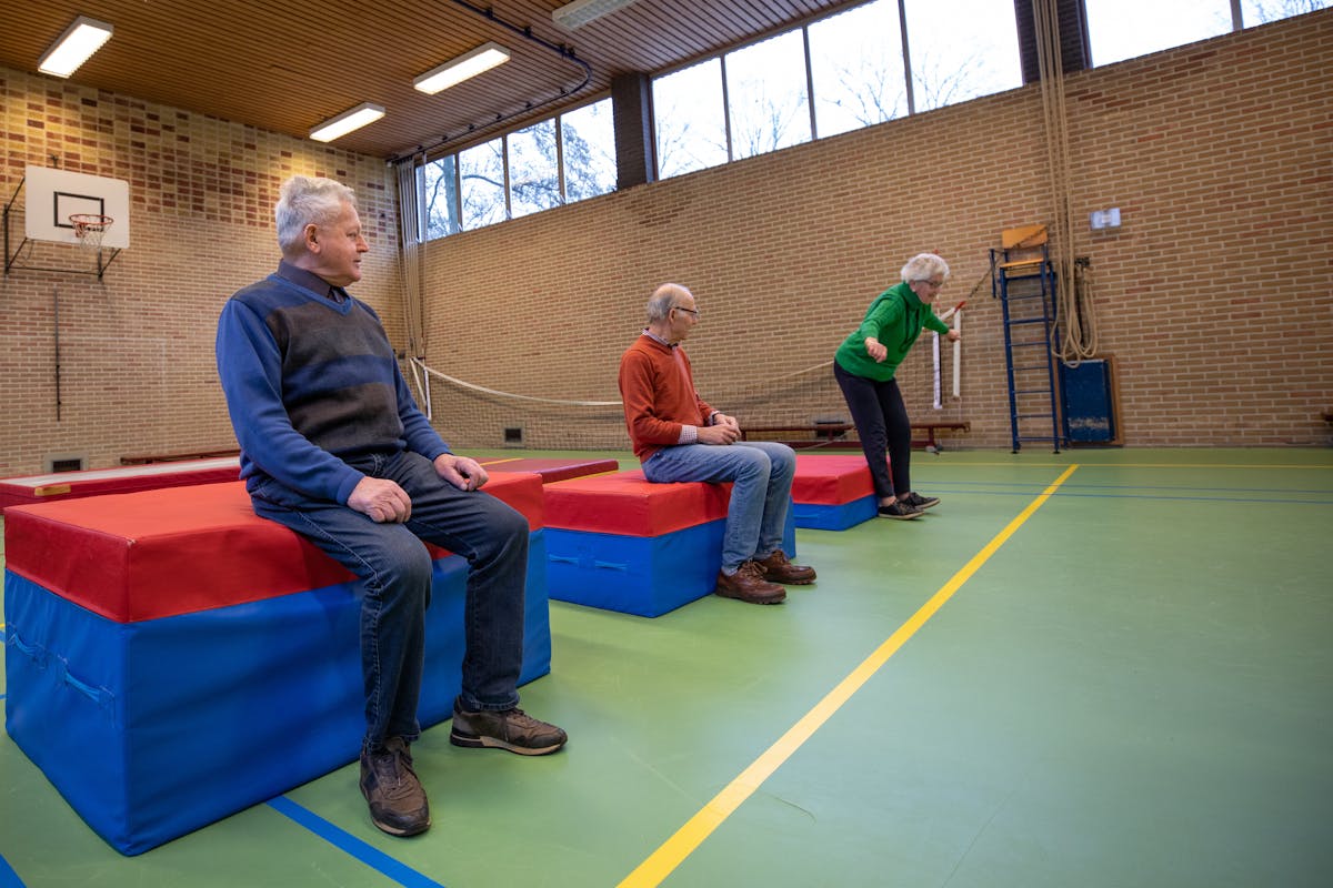 Tot slot nog even terug naar de gymzaal. Frans heeft zijn rollator aan de kant gezet en gaat nu lopend de deur uit. Hij heeft zichtbaar aan vertrouwen gewonnen, net als de overige deelnemers. Aan het begin van de cursus vroegen we hen om hun zelfvertrouwen in het bewegen te beoordelen. Hetzelfde deden we aan het einde van de cursus. Men groeide van een 4,5 naar een 7,3. Ik ben benieuwd hoeveel er 100 mogen worden 😉