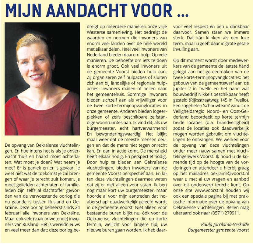 De opvang van Oekraïense vluchtelingen. En hoe intens het is als je onverwacht ‘huis en haard’ moet achterlaten. Wat moet je doen? Wat neem je mee? Er is paniek en er is gevaar. Je weet niet wat de toekomst je zal brengen of waar je terecht zult komen. Je moet geliefden achterlaten of familieleden zijn zelfs al slachtoffer geworden van de verwoestende oorlog die nu gaande is tussen Rusland en Oekraïne. Deze oorlog beheerst sinds 24 februari alle inwoners van Oekraïne. Maar ook vele (vaak onwetende) inwoners van Rusland. Het is wereldnieuws en veel meer dan dat: deze oorlog bedreigt op meerdere manieren onze vrije Westerse samenleving. Het bedreigt de waarden en normen die inwoners van enorm veel landen over de hele wereld met elkaar delen. Heel veel inwoners van Nederland bieden daarom hulp. Op vele manieren. De behoefte om iets te doen is enorm groot. Ook veel inwoners uit de gemeente Voorst bieden hulp aan. Zij organiseren zelf hulpacties of sluiten zich aan bij landelijke of regionale hulpacties. Inwoners mailen of bellen naar het gemeentehuis. Sommige inwoners bieden zichzelf aan als vrijwilliger voor de twee korte-termijnopvanglocaties in onze gemeente. Anderen bieden logeerplekken of zelfs beschikbare zelfstandige woonruimtes aan. Ik vind dit, als uw burgemeester, echt hartverwarmend! En bewonderingswaardig! Het blijkt maar weer dat de meeste mensen deugen en dat de mens niet tegen onrecht kan. En dan in actie komt. De mensheid heeft elkaar nodig. En perspectief nodig. Door hulp te bieden aan Oekraïense vluchtelingen, bieden inwoners van de gemeente Voorst perspectief aan. En laten deze vluchtelingen daarmee weten dat zij er niet alleen voor staan. Ik ben nog maar kort uw burgemeester, maar hoorde al voor mijn aantreden dat ‘noaberschap’ daadwerkelijk geleefd wordt in de gemeente Voorst. Niet alleen voor bestaande buren blijkt nu; óók voor de Oekraïense vluchtelingen die op korte termijn, wellicht voor langere tijd, uw niéuwe buren gaan worden. Ik heb daarvoor veel respect en ben u dankbaar daarvoor. Samen staan we immers sterk. Dat kán klinken als een loze term, maar u geeft daar in grote getale invulling aan.