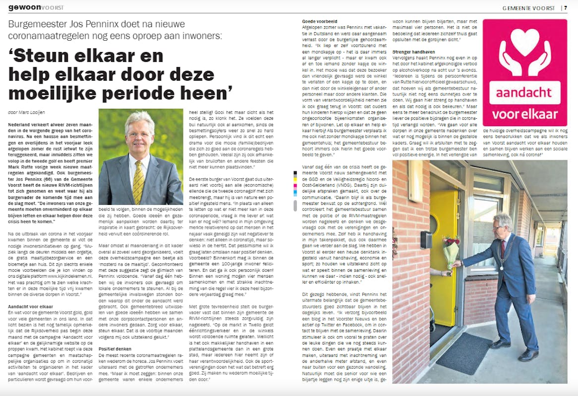 Wisten jullie dat burgemeester Jos Penninx elke week een blog schrijft over zijn belevenissen? Deze blogs kun je hier allemaal teruglezen. Afgelopen woensdag stond er ook een interview in de bijlage bij Nieuwsblad Stedendriehoek (zie hier pagina 6-7). Wat in alle berichten duidelijk wordt is dat de burgemeester heel nadrukkelijk oproept tot aandacht voor elkaar. En hoe mooi is het dat hij daarbij ook ons digitale dorpsplein Kijk in de Kernen noemt!