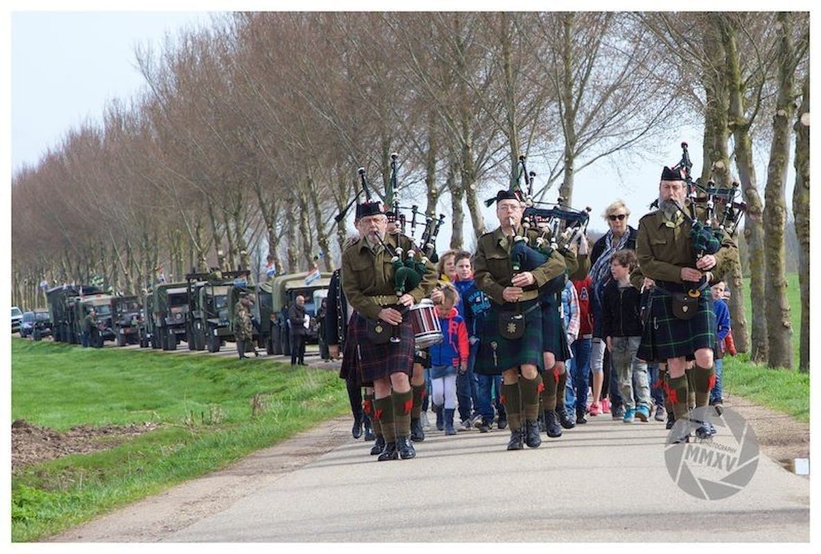 Pipers vooraan in de stoet