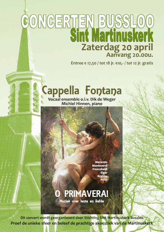 Op 20 april aanstaande voert het vocaal ensemble Cappella Fontana o.l.v. Dik de Weger in de St. Martinuskerk Bussloo een programma uit met madrigalen en koorliederen rond het thema Lente en Liefde. Het voorjaar is in deze tijd van het jaar een voor de hand liggend thema, evenals de (ontluikende) liefde. Tal van componisten hebben daar muziek over geschreven.