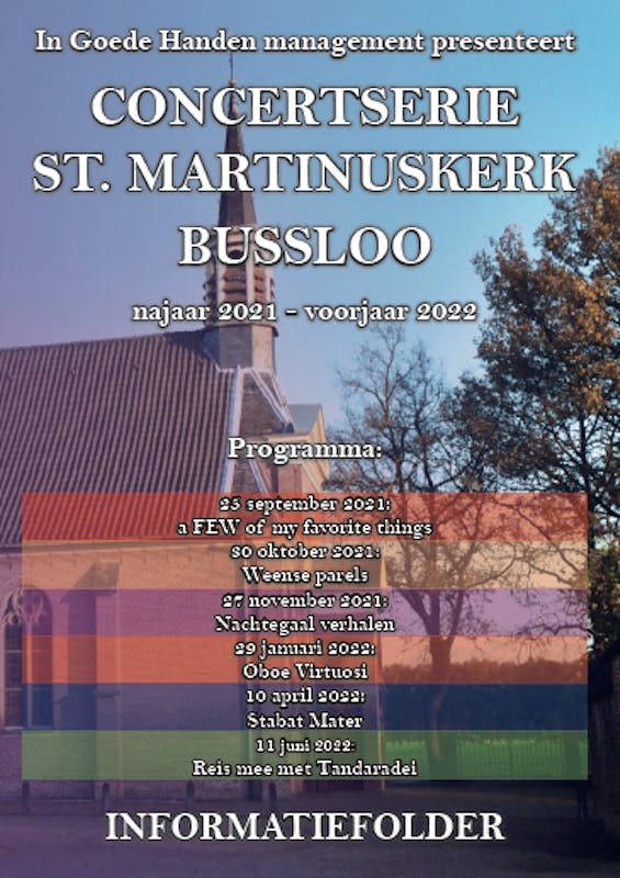Dit seizoen organiseert In Goede Handen Management i.s.m. de Sint Martinuskerk in Bussloo 6 concerten op de zaterdagavond. Variërend van blokfluitensembles, klassiek duo, middeleeuwse liederengroep, baroktrio tot Pergolesi’s Stabat Mater met saxofoons.