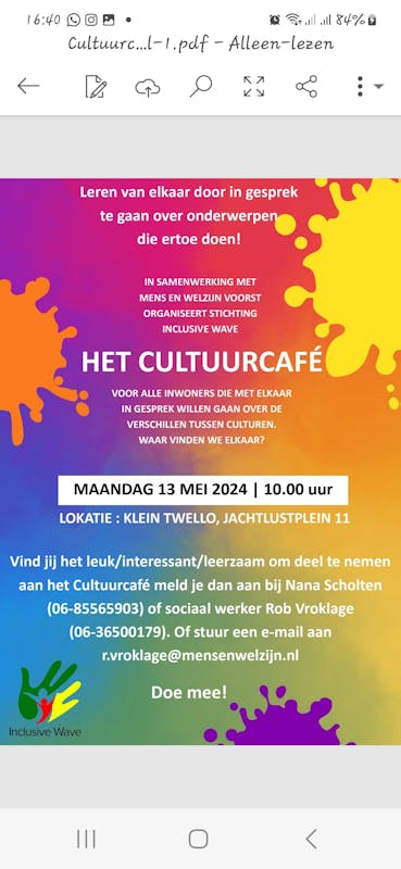 Op maandag 13 mei is het 2e cultuurcafe. Over de verschillen tussen verschillende culturen en hoe te leren van elkaar en verbinding te maken.