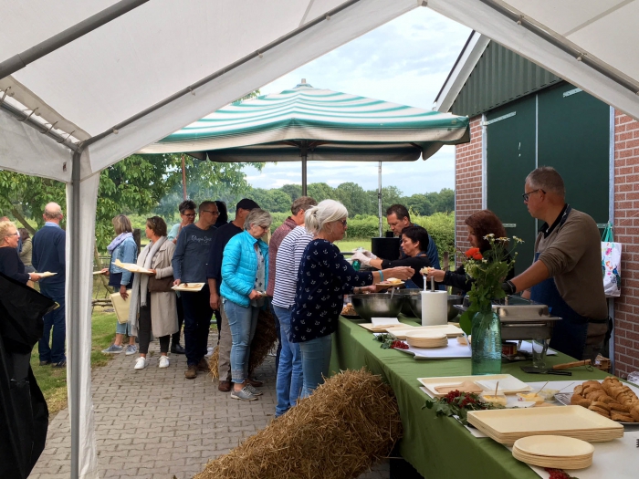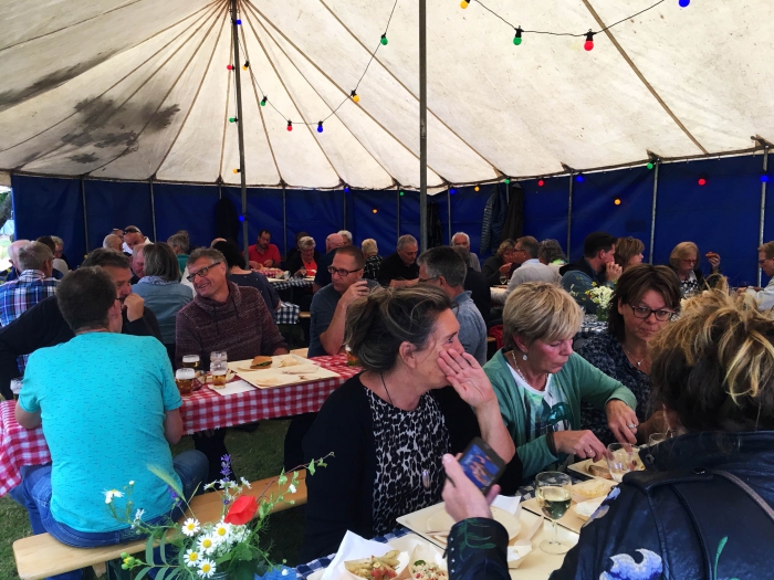 Afgelopen zaterdagavond was het genieten op het boerenerf van de familie Bussink in Bussloo. De Stichting “Wilp Staat Op” was hier verantwoordelijk voor “Voer bie de Boer”. Een sfeervol evenement, waarbij op een bourgondische wijze het leven gevierd werd. Tussen de appelbomen en in het zicht van een kudde koeien namen bijna 80 levensgenieters plaats voor een gemoedelijke, bourgondische en gezellige avond. Het terrein was prachtig aangekleed met kleurrijke lampjes, vele sfeerlichtjes en vuurkorven. Lange tafels waren verfraaid met veldboeketten en grote houten kisten fungeerden als statafels. De boomgaard achter de boerderij kreeg zodoende de uitstraling van een pittoreske Franse plattelands tuin.