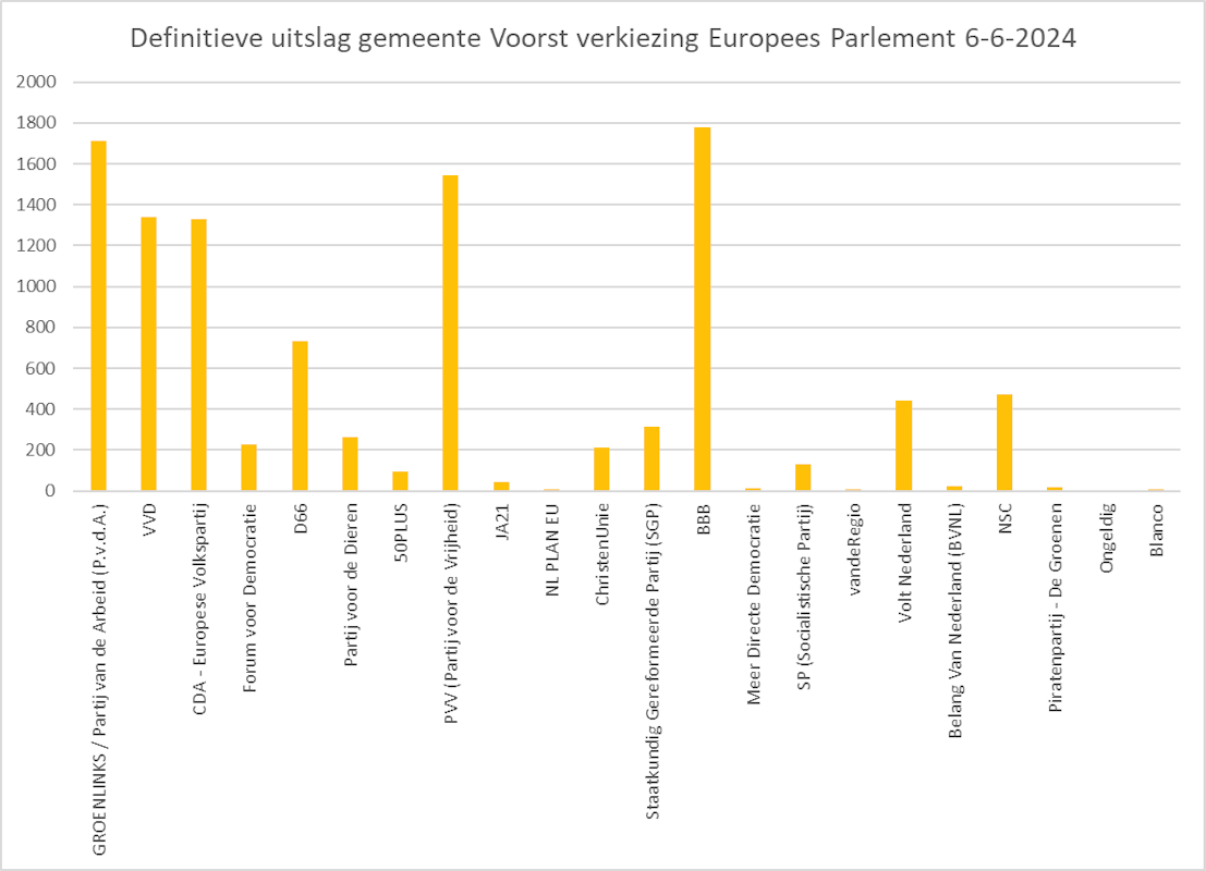 De drie partijen met het grootste aantal stemmen in de gemeente Voorst zijn BBB (16,6%), GLPVDA (16,0%) en PVV (14,4%). Daarna volgen VVD (12,5%) en CDA (12,4%).