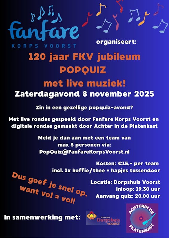 Test je muziekkennis samen met je vrienden, familie of collega's en strijd om de titel van 'Muzikale Maestro' van Voorst! Verwacht een avond vol diverse muziekstijlen, uitdagende vragen en natuurlijk een heleboel gezelligheid.