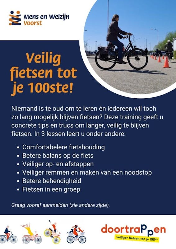 De succesvolle training ‘Veilig Fietsen’ wordt vanaf 10 & 12 april herhaald. Mens en Welzijn Voorst en Henk Lubberding hebben de training doorontwikkeld naar een driedelige training die vol zit met allerlei tips die de fietsveiligheid en het fietsplezier verhogen. De deelname is gratis, maar vanwege verwachte drukte en beperkt aantal plekken is aanmelden noodzakelijk.
