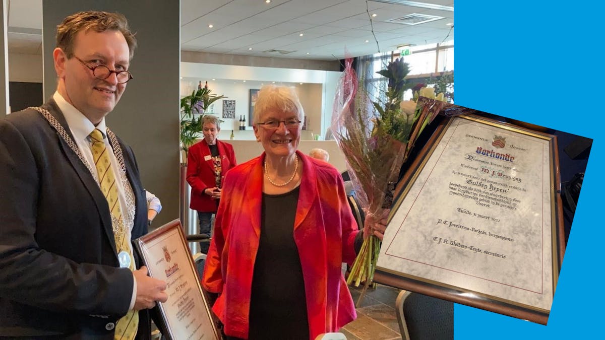 Gisteren kreeg Riet Brugman, die jarenlang deel uitmaakte van de Huurdersbelangenvereniging IJsseldal, de gemeentelijke onderscheiding 'de Gulden Keper' door locoburgemeester Arjen Lagerweij uitgereikt. Ze kreeg deze onderscheiding omdat zij zich vele jaren verdienstelijk maakte op maatschappelijk gebied in de Gemeente Voorst. Riet werd verrast tijdens haar afscheid van de vereniging.