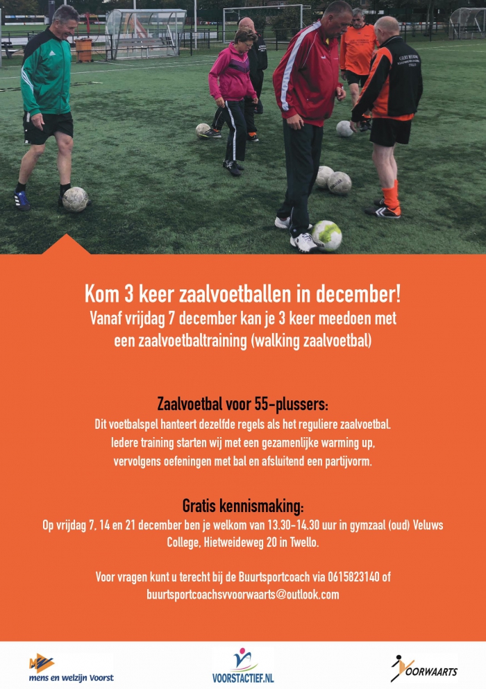 Voor 55-plussers start op vrijdagmiddag 7 december een zaalvoetbaltraining onder begeleiding van de buurtsportcoach van SV Voorwaarts. Deze activiteit voor 55 plussers wordt samen met Mens en Welzijn Voorst georganiseerd. Lekker ouderwets een potje zaalvoetballen. Drie weken lang kan er gratis kennis gemaakt worden met (walking) zaalvoetbal.