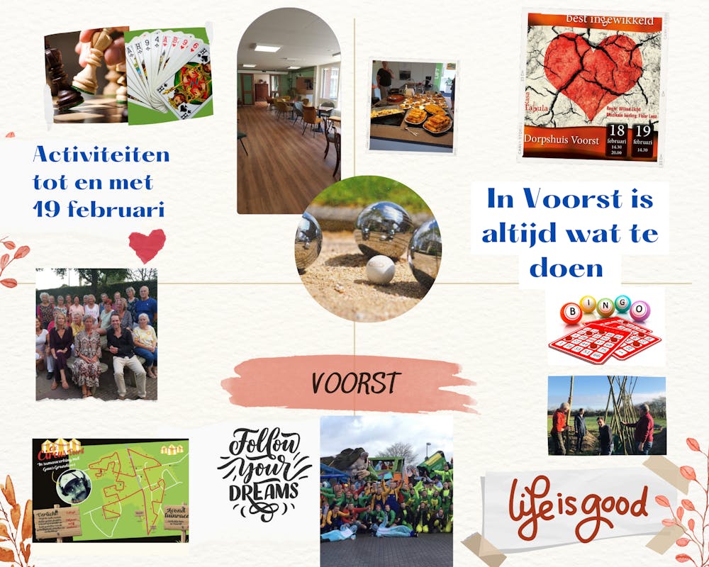 Van Bingo tot lichtjesoptocht. Een greep van wat er tot en met 19 februari zoal te doen is in dorp Voorst vind je in de afbeelding.