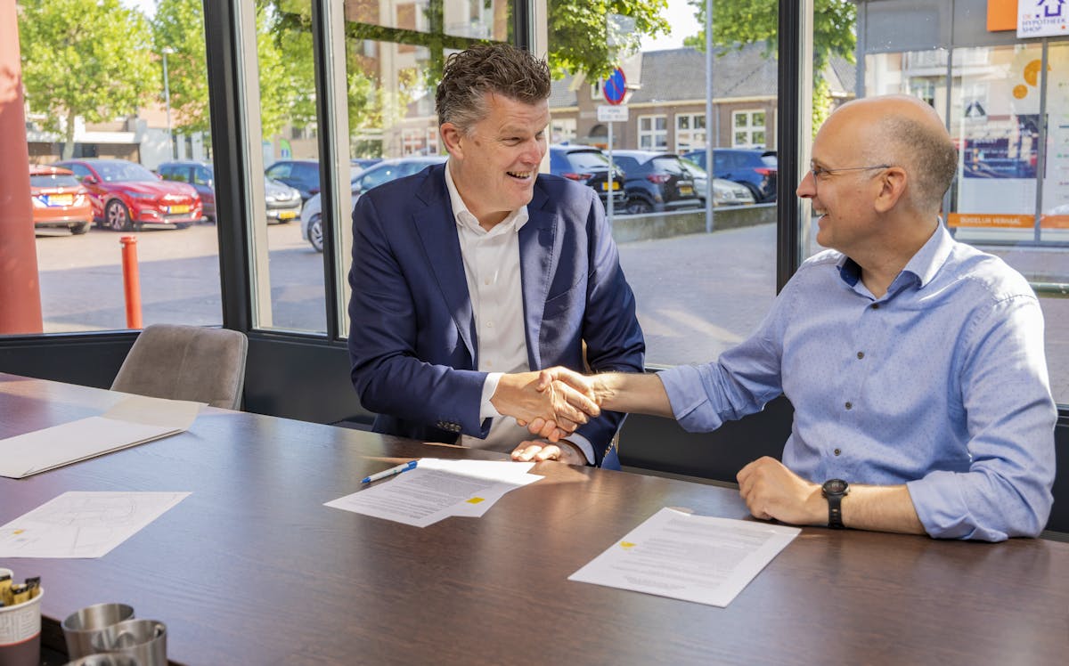 Vanochtend ondertekenden wethouder Bert Visser van de Gemeente Voorst (links op de foto) en Dave van Zalk namens IJsseldal Wonen een intentieovereenkomst voor de ontwikkeling van de ‘Winkler Prins locatie’ in Voorst. Hierin maken wij met de gemeente afspraken over de ontwikkelfase van deze plek. IJsseldal Wonen wil woningzoekenden op de huurmarkt in onze regio een passend thuis bieden tegen een betaalbare prijs. Daar draagt dit plan ook weer aan bij.